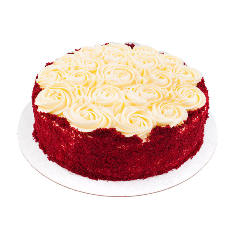 One of our most popular cakes, our delicious Red Velvet Cake is made with red chocolate sponge, layered with buttercream and topped with our famous cream cheese frosting, designed in an elegant rosette pattern.