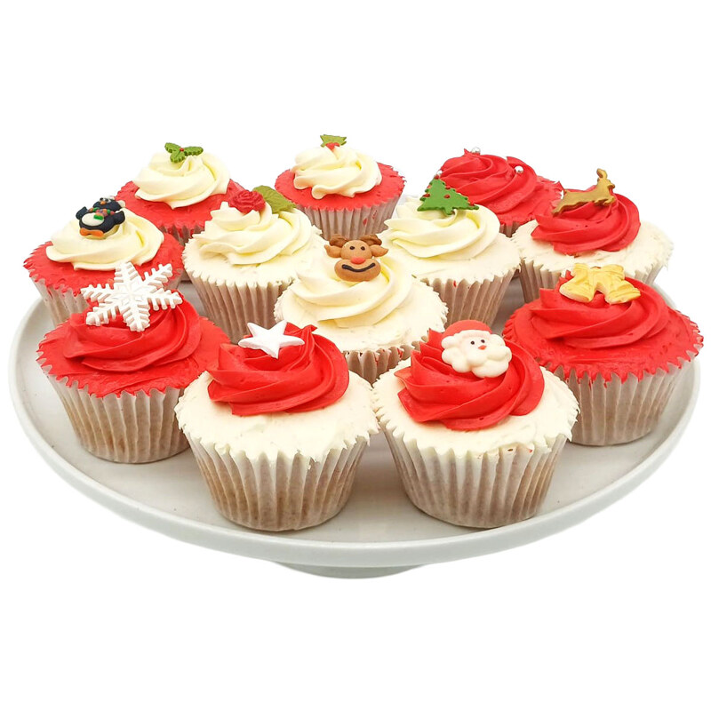 Our Christmas Cupcakes are made of soft vanilla sponge with red and white cream cheese frosting topped with fun sugar decorations including holly, red berries, stars, reindeers, Father Christmas, snowflakes, ribbons and sprinkles. Elegantly packaged in our dreamy Fairy Box tied with red ribbon - a wonderful festive gift!