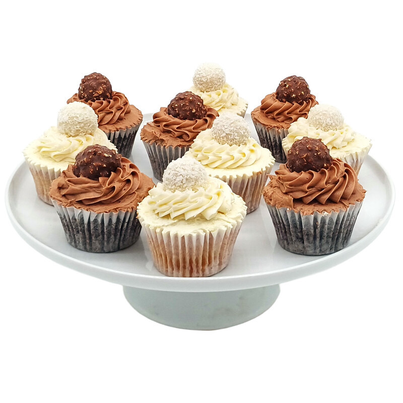 An exquisite combination of Nutella filled chocolate sponge cupcakes with Nutella buttercream frosting topped with a Ferrero Rocher and Vanilla coconut sponge cupcakes filled with white chocolate coconut cream and white chocolate coconut frosting topped with a Ferrero Rocher Raffaello!