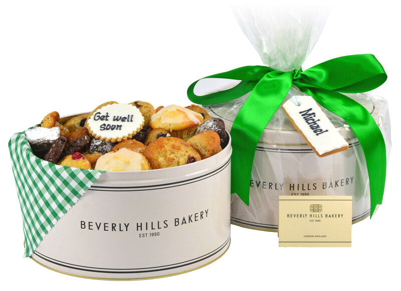 Our Get Well Gift Tin is a kind and supportive way to wish a loved one or colleague best wishes for a speedy recovery. Filled with our Classic range of muffins, cookies and brownies with an additional handmade "Get Well Soon" cookie banner and a personalised hanging "Name" cookie. Decorated in green gingham cloth & ribbon.