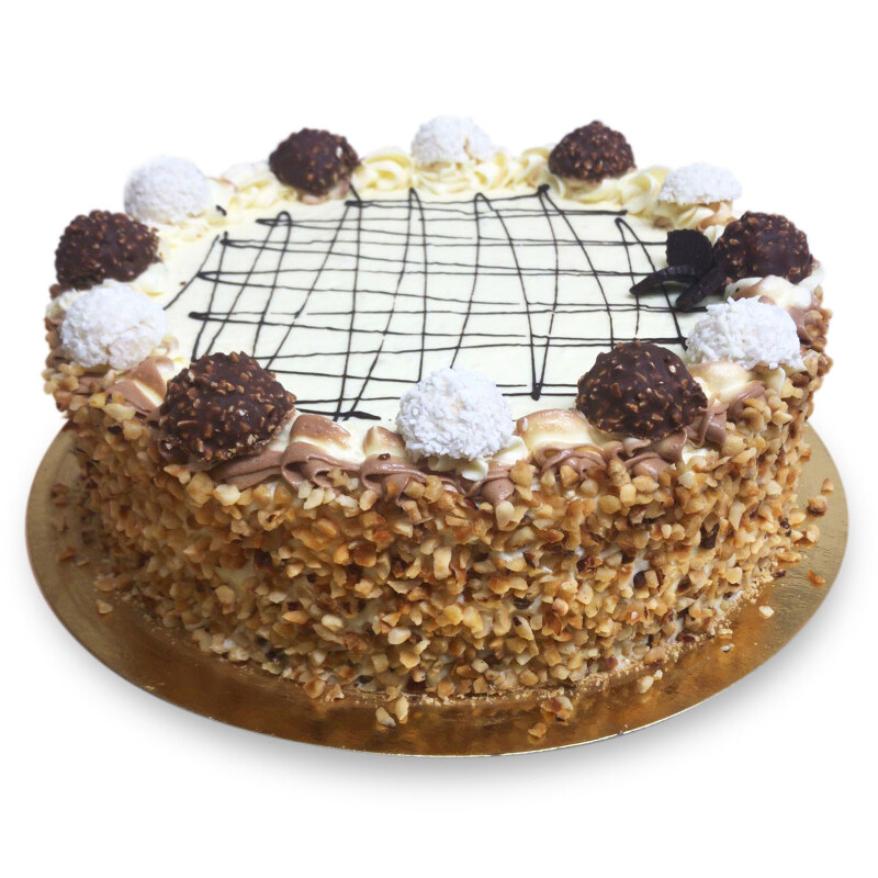 Fit for the Ambassador's reception, this exquisite cake is one of BHB's own creations. Tropical coconut infused sponge on a chocolate layered base, filled with a Ferrero Rocher/Nutella frosting with added delicate coconut flavour, is topped with an array of the infamous Ferrero Rocher and Raffaello chocolates, handmade chocolate leaves. chocolate sprinkles with a surround of crushed hazelnuts.