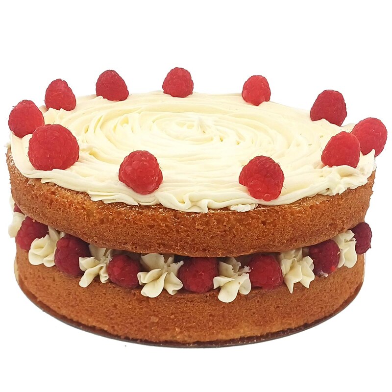 Fresh raspberries and soft cream cheese fill this light and fluffy vanilla sponge cake topped with more raspberries and sprinklings of sugar - a delightful tea cake!