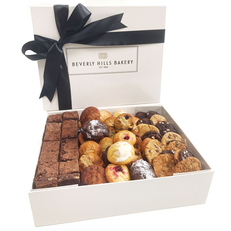 Introducing our latest creation - the BHB Classic Gift Box filled to the brim with freshly baked mini muffins, cookies and brownies of a variety of delicious flavours. Double chocolate, lemon, apple & cinnamon, blueberry, cranberry, carrot & raisin and strawberry & white chocolate mini muffins, chocolate chip, double chocolate chip and oatmeal & raisin mini cookies finished with our famous chocolate & walnut mini brownies. Packaged in our elegant BHB cake box, decorated with ribbon and a message card. Ideal for office parties and breakfast meetings, picnics, birthday and tea parties and new baby births!