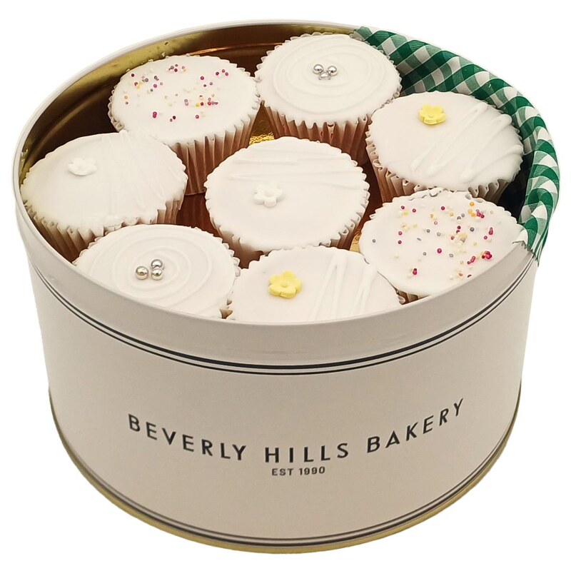 Our classic fairy cupcake gift tin contains 16 cupcakes made of soft vanilla sponge, decorated with white sugar frosting and decorations, elegantly with green gingham cloth and ribbon.